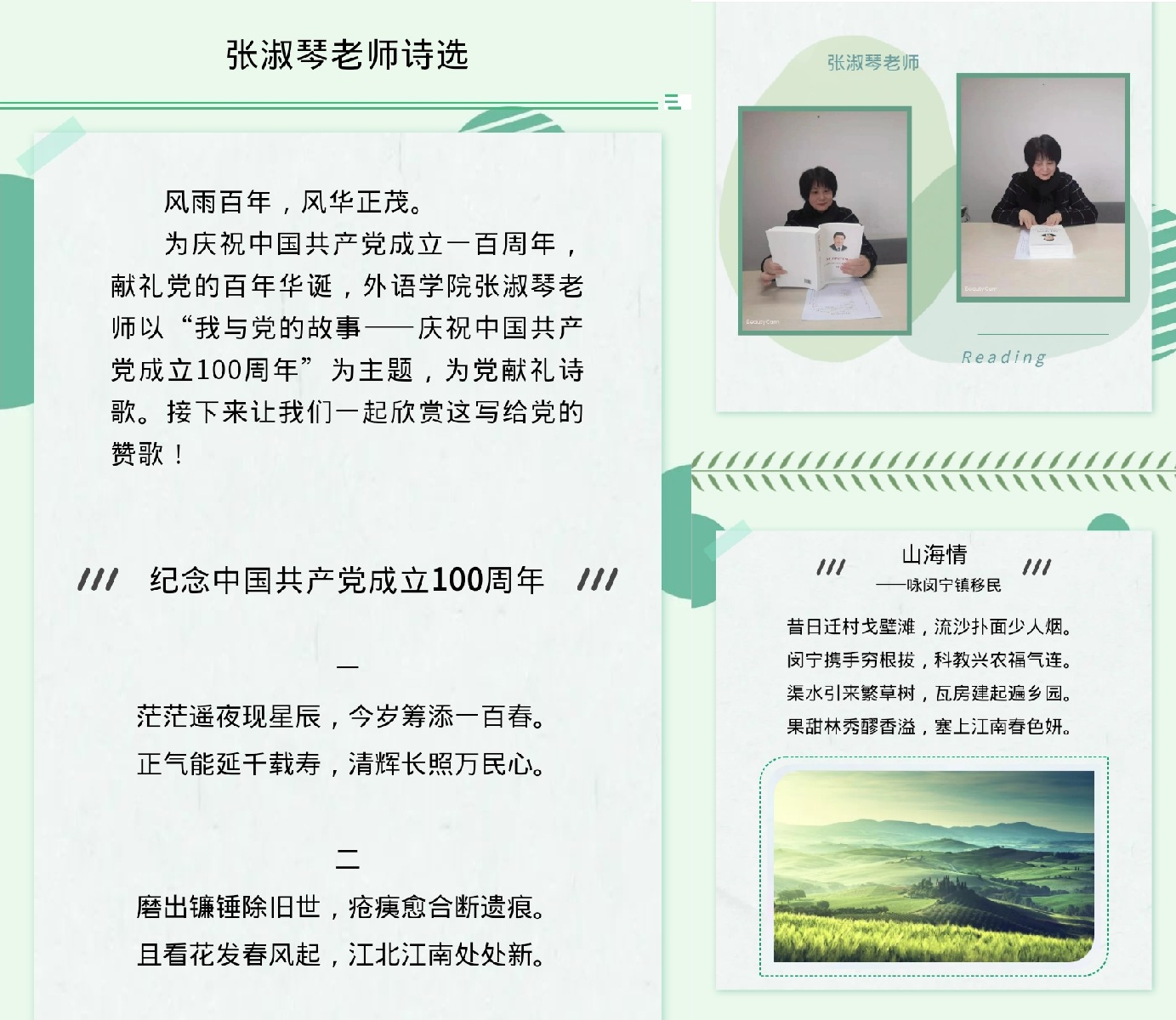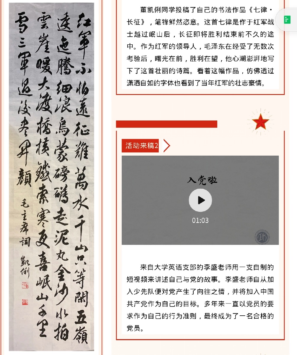 激昂发声,唱响党史学习主旋律”。365英国上市网站官网党委坚持紧扣“为什么学习党史”“学什么党史”“怎样学习党史”三大问题,还充分利用新媒体,打造极具专业特色的虚实结合党史学习平台,面向全院师生开展红色征集令——我与党的故事,使党史文化理论更具有吸引力,促进党史文化真正实现“入脑、入心”,坚持做好学院师生党史学习教育的“传声筒”;依托“东华外院新闻站”公共号开辟党史学习微专栏,易班平台开展“党史故事我来讲”等丰富多彩的活动平台,坚持党史学习教育的引领地位,以此发挥出党史学习教育的强大育人功能;通过利用互联网创设教学情境,打造“互动式+体验式”党史学习新课堂,将党史融入学院全员、全程、全课程育人的大格局,打通党史教育“最后一公里”,将党史的滋养转化为全院师生的政治本色,奋斗的行动动力。