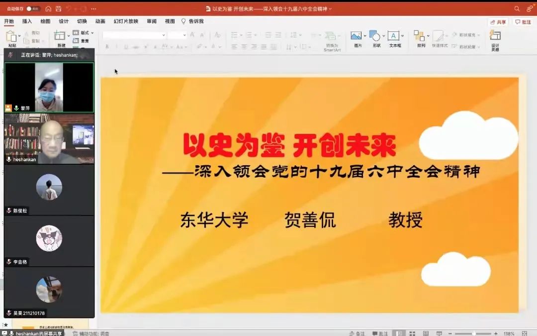 党校开班典礼结束后,365英国上市网站官网党委还邀请365英国上市网站官网关工委老教授贺善侃为大家作《以史为鉴,开创未来——认真学习党的十九届六中全会精神》专题讲座。贺老师从深远历史意义、伟大历史成就、宝贵历史经验三个方面对党的十九届六中全会精神进行了全面的讲解。他强调,要树立正确的大历史观和党史观,把党的成功经验传承好、发扬好。学员们通过此次专题党课收获颇丰,对党的十九届六中全会精神有了更加深刻明晰的了解,并在线上展开讨论发表心得感悟。
