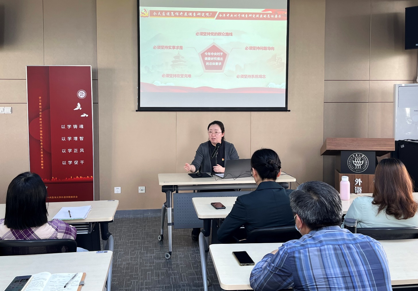 (5月23日,日语系党支部集体学习习近平总书记《在学习贯彻习近平新时代中国特色社会主义思想主题教育工作会议上的讲话》精神,并交流学习体会)